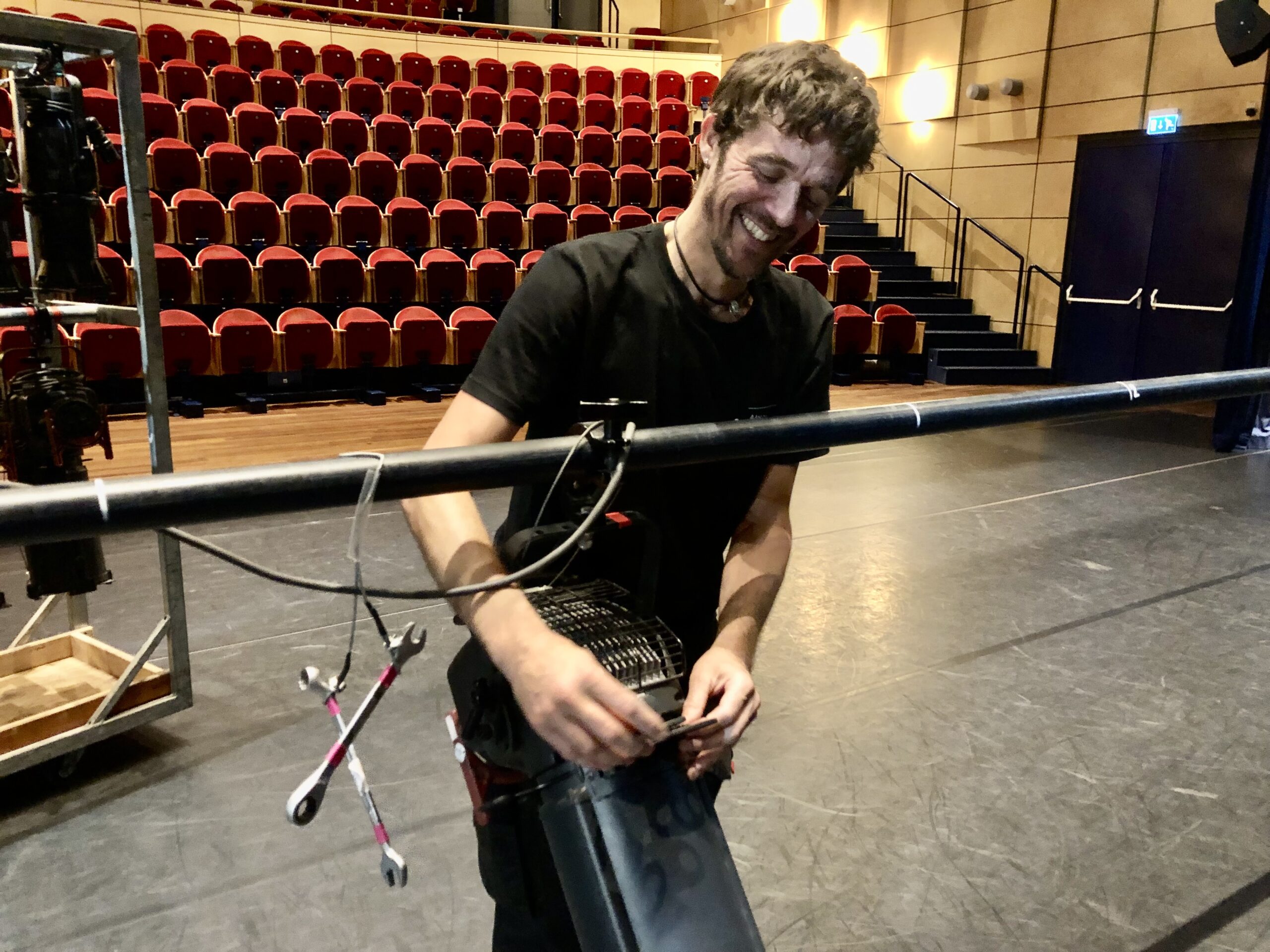 Zelf gaat Mirek al aardig wat jaartjes mee in de techniek en heeft hij veel zien veranderen. Hij klopt op een van de grote lampen. “In deze flinke jongens zitten nog halogeenlampen, maar een aardig deel van wat er hangt is ledverlichting.” Ook een verschil met vroeger zijn de verbindingen. “Voorheen moest er zo’n dik pak kabels getrokken worden.” Met twee handen maakt Mirek een grote opening en houdt vervolgens zijn duim en wijsvinger een klein stukje van elkaar. “Nu gaat alles door zo’n dun kabeltje.” En was vroeger alles analoog, tegenwoordig gaat het meeste digitaal. “Met een laptop of een app op je telefoon kun je van alles inregelen en aansturen.” Het heeft volgens Mirek veel voordelen, maar het vergroot wel de afstand tot het toneel. “Er is minder contact omdat alles digitaal gaat, maar uiteindelijk gaat het wel om wat er op het toneel gebeurt. We moeten ervoor waken dat we dat niet uit het oog verliezen.”
